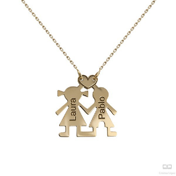Gargantilla de oro amarillo con un niño y una niña, para personalizar con sus nombres. El regalo ideal para las que son o van a ser mamás. Longitud cadena: 43 cm.